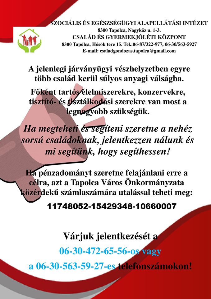 A Szociális és Egészségügyi Alapellátási Intézet központi épületének bejáratánál( Tapolca, Nagyköz u. 1-3) civil szervezetek, ügyes kezű önkéntes segítők által készített mosható szájmaszkok elvihetők.Becsületkasszát abból a célból helyeztünk ki, hogy aki tud segítse a további anyagköltség biztosítását.